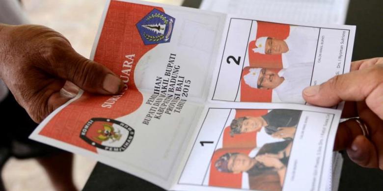 petugas pemungutan suara memberikan surat suara kepada pemilih di tempat pemungutan suara di Kuta, Bali, 9 Desember 2015. 100 juta pemilih hari ini memberikan suara untuk pemilihan kepala daerah yang dilakukan serentak di 32 provinsi
