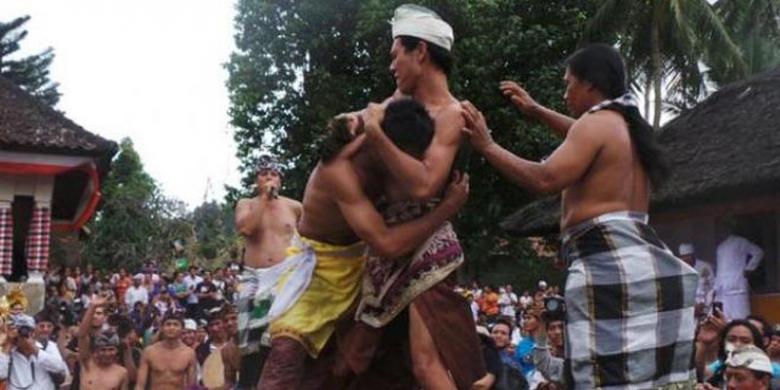 TRIBUN BALI/SAIFUL ROHIMRibuan orang memadati balai banjar Desa Tenganan Dauh Tukad, Kecamatan Manggis, Kabupaten Karangasem, Bali, Selasa (15/7/2014). Mereka begitu antusias menyaksikan tradisi Mekare-karean atau Perang Pandan.